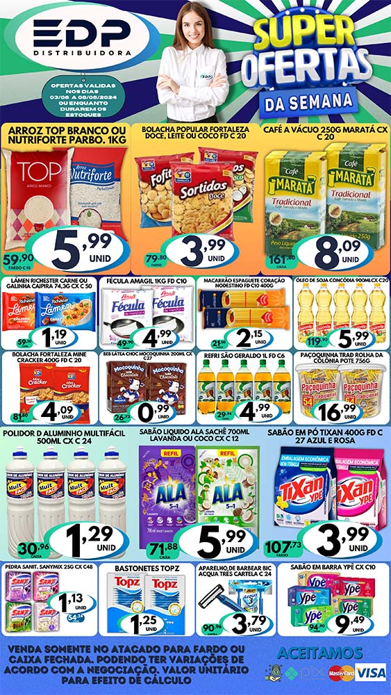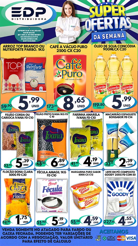Arroz 101 Açúcar Feijão de corda Óleo de soja Flocão Dona Clara Café Santa Clara Fécula de mandioca Amafil Farinha de trigo Dona Benta Trigo Medalha de Ouro 50kg Macarrão Fortaleza